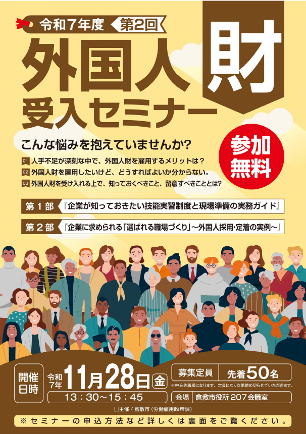 少子高齢化の進展による深刻な人手不足を背景に、我が国にとって、今や外国人は重要な働き手となっており、今後、外国人労働者を雇用したいと考えている市内企業の担当者及び従業員等を対象に「第2回外国人財受入セミナー」を開催します。